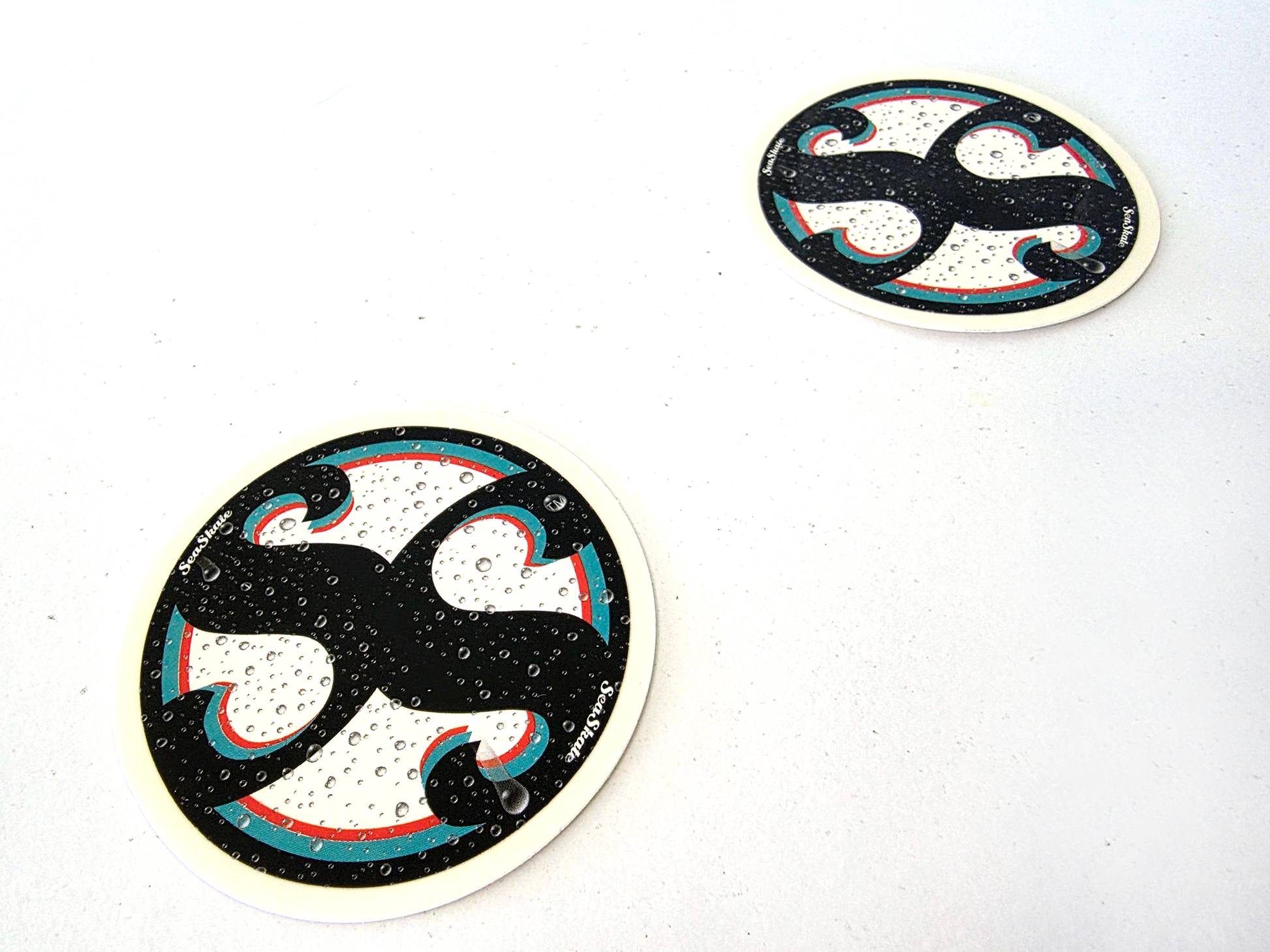 Each silkscreen sticker is run through the press 7 times -- 3 clear coats of Gloss UV-Protective ink and 4 passes of color.